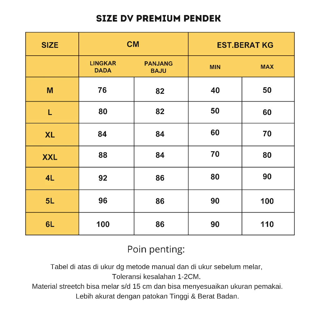 XL : BB 55-60 kg, lebar dada 42 cm, panjang dari bahu ke bawah 82 cm.