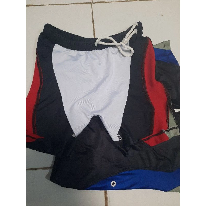Celana khusus untuk berenang anak laki-laki usia sekolah dasar dengan warna bahan dasar hitam dan dihiasi dengan lis berwarna cerah di kedua sisinya.