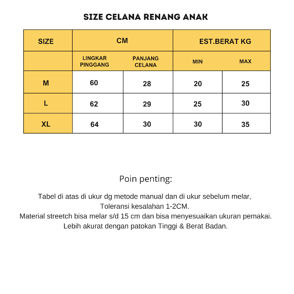 Celana renang dan baju renang anaknya bagus, anak saya senang banget. Hanya butuh sedikit lebih banyak variasi ukuran untuk anak kecil.