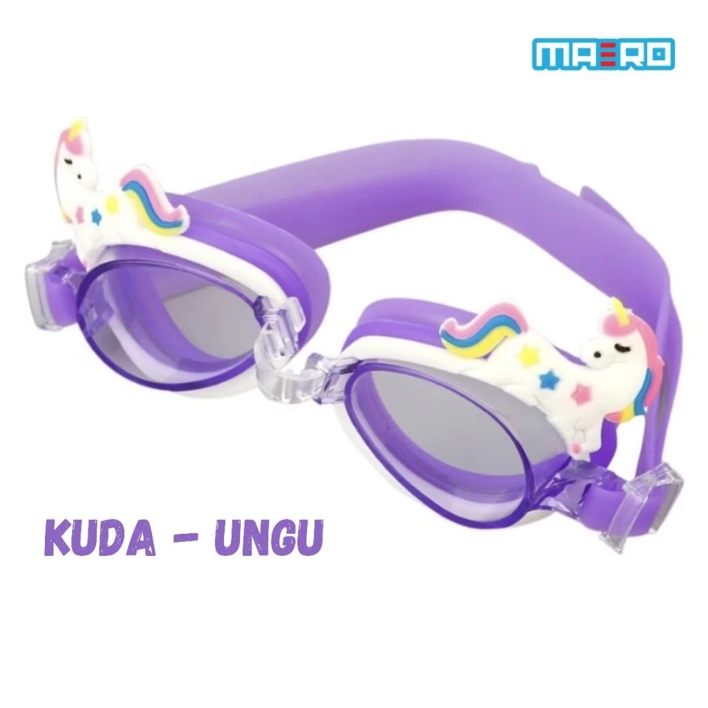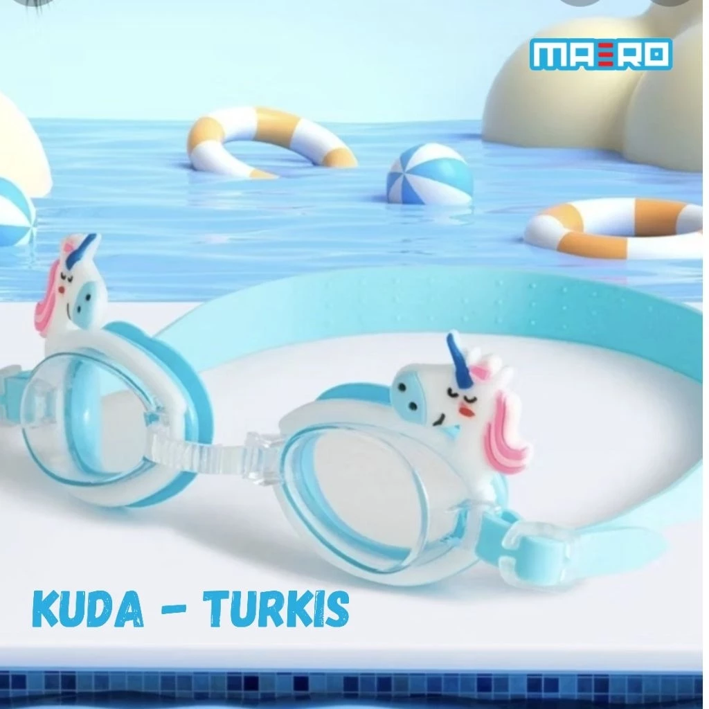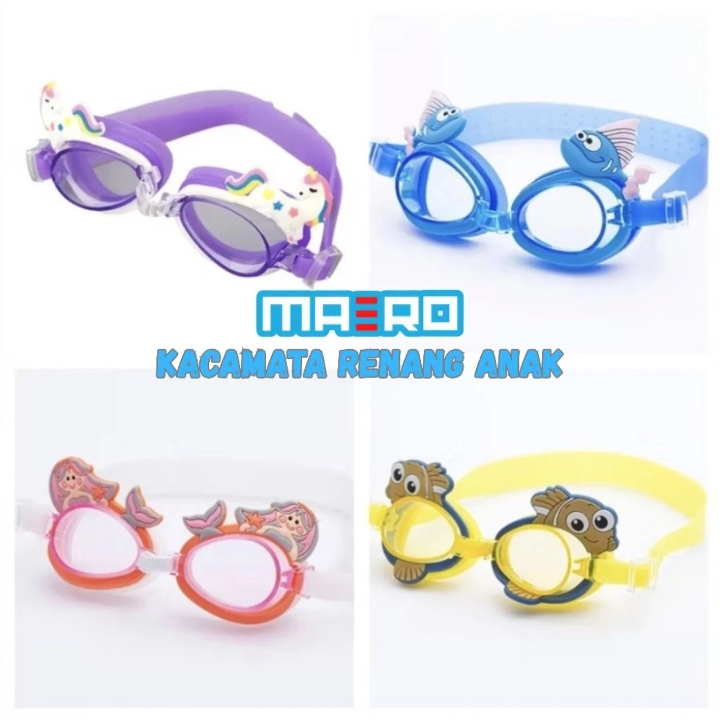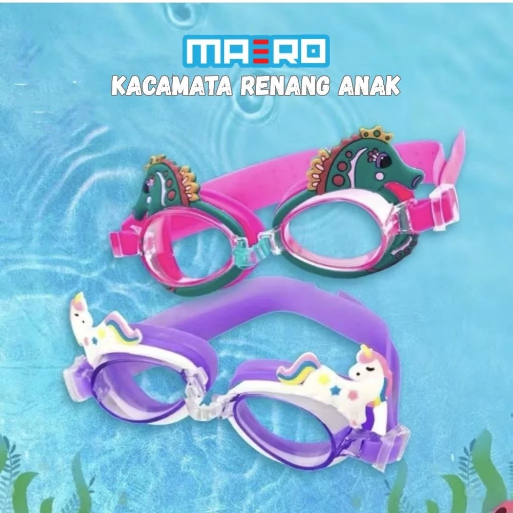 Kacamata renang anak MAERO hadir dengan desain karakter lucu seperti Unicorn, Ikan, Dinosaurus, dan Putri Duyung yang disukai anak-anak.